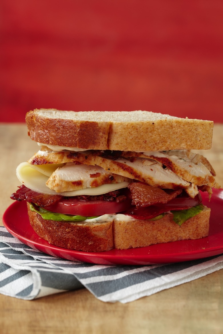 Everyone likes turkey clubs, but let's face it: They are a little old-school. I decided to funk out a club sandwich by making it with chicken and delicious pesto mayonnaise to bump up the flavor. The tomatoes are a little work but well worth it. I love the layers of flavor in this sandwich.