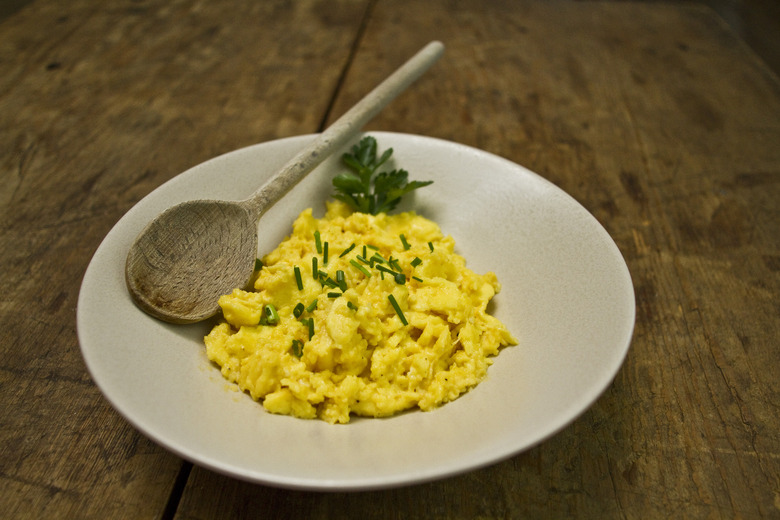 Just before the scrambled eggs appear to be set and ready to eat, transfer them to a plate. The residual heat will continue cooking the eggs and they'll be perfect, not overcooked, by the time they get to a table. If you garnish, garnish with chives and a thick slab of buttered toast and you've got yourself a breakfast to be proud of.