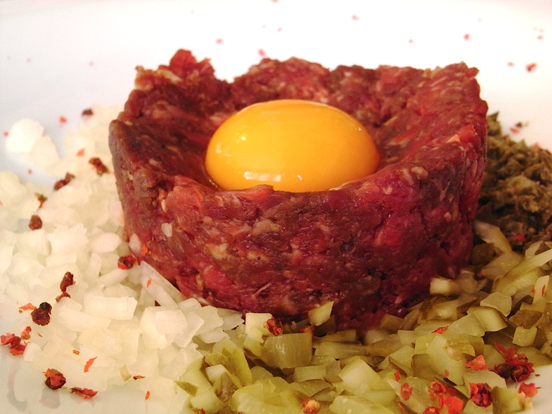Classic French steak tartare is undoubtedly the most commonly known of the hacked-up raw meat dishes. Seasoned with a simple but potent mixture of Dijon mustard, Worcestershire, salt, pepper, chopped onion and cornichon and a little hot sauce if you desire, tartare is beefy, tangy and tender. The acidic mustard and Worcestershire cures the meat very lightly, giving it that slightly opaque pink outer coating rather than remaining a uniform glossy red. Why the egg yolk? It's nature's perfect raw sauce.