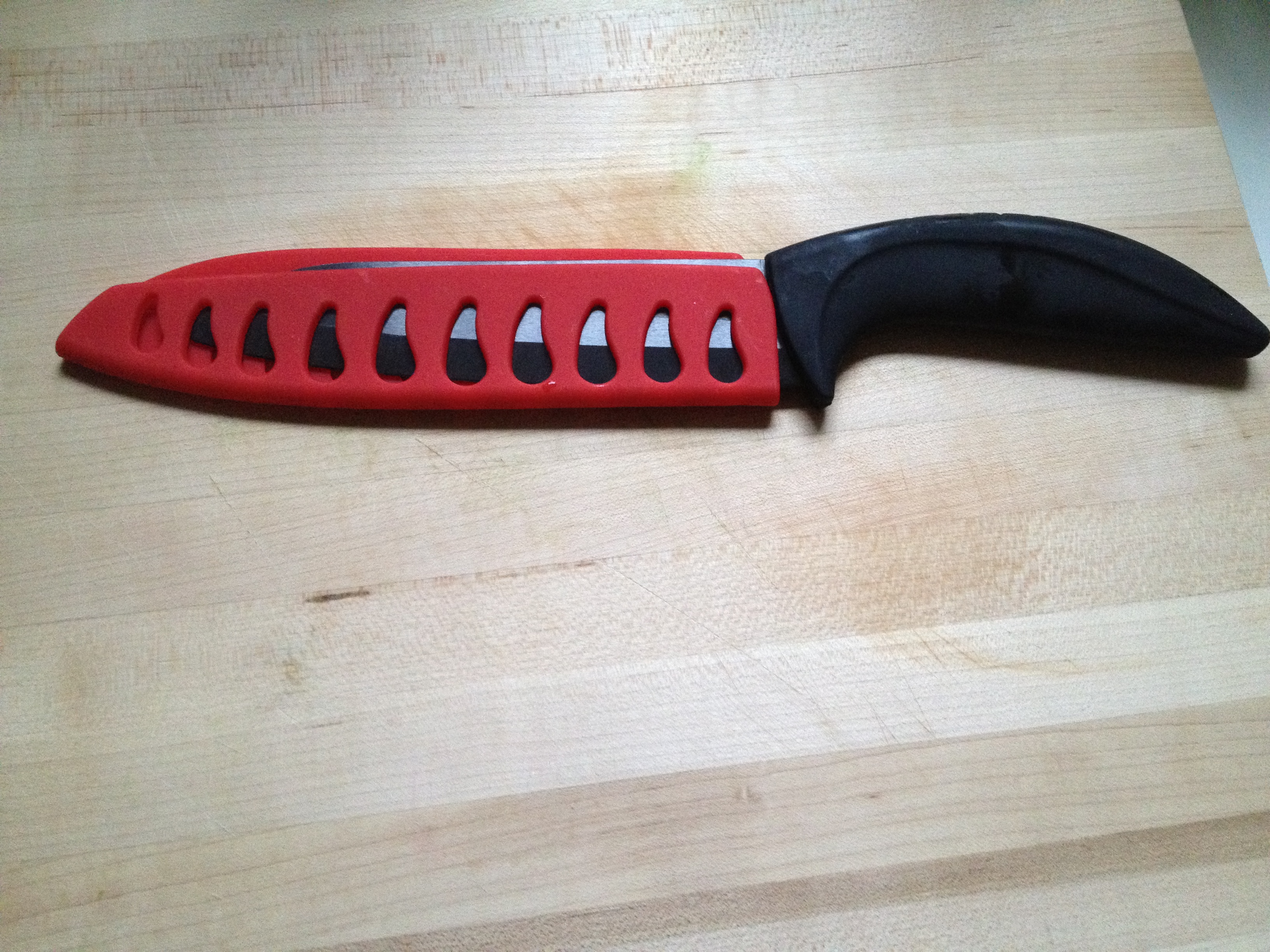 The knives come with a red blade guard to keep it sharp — and to keep you from slicing yourself.