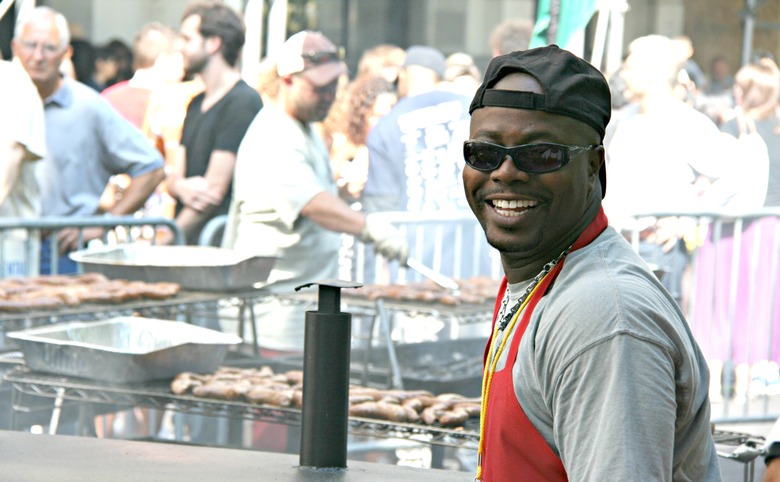 Rodney Scott runs Scott's Pit Cook Bar-B-Que in Hemingway, South Carolina with his parents and a couple of family members. The town is a very small dot on the map, halfway between Wilmington and Charleston and not really on the way to anywhere. That's why it was absolutely crucial that Scott made the long trip north this past weekend to the Big Apple BBQ in New York City's Madison Square Park. With apologies to Ed Mitchell, Scott's supremely smoky pulled pork was the best porcine product I tried — soaked with a vinegar sauce and lined with squares of crunchy pig skin for good measure. I caught up with him just before diving into the plate.