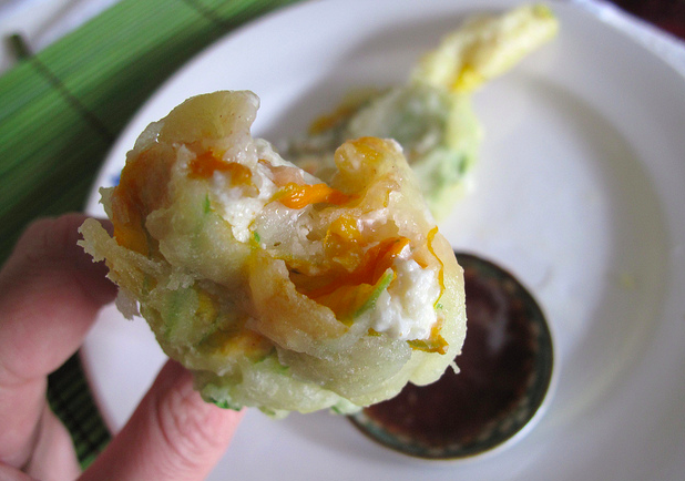 Fiori di Zucca Ripieni – Fried, yet delicate, zucchini flowers stuffed with salty anchovies and sweet, creamy ricotta.