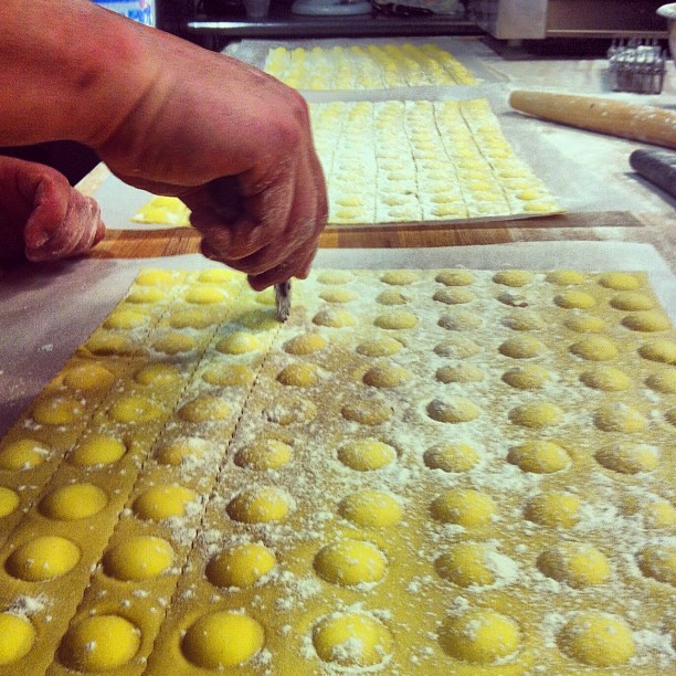 Lining up the Francobolli ravioli filled with robiola cheese #pasta #osteria #eatthisboys! [/caption]