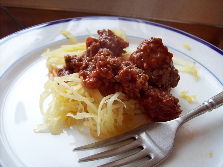 Happy test kitchen day! I ducked out of prep to talk about what I'll be eating for lunch and dinner for at least a week or until I get sick of it, but I don't see that happening. I've been replacing pasta with spaghetti squash for the following reasons: