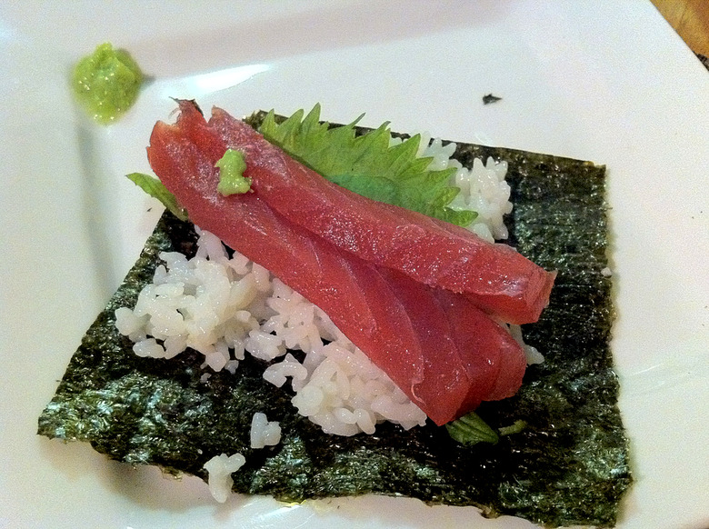 Temaki, as opposed to maki (cut sushi rolls) are more of a rice wrap. Check out this recipe for salmon shioyaki for an idea of how basic it can go. A sushi chef at a restaurant will probably use a rolling mat to make a tight, perfect cone of something awesome. But you don't have to. Temaki can be round or conical or look more like a lettuce wrap or taco. It's mainly about good sushi rice and good filling coming together in a sushi-like application that has all of the flavor without the horrific mess and feeling of failure as a cook, not to mention the mangling of $20 worth of raw fish that never did anything to me. (Shh, Jess, it's okay, you're a good cook.)