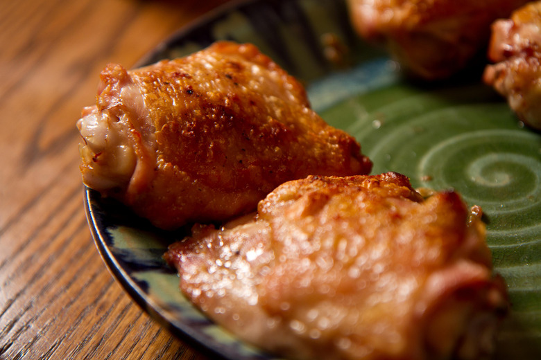 A thigh, on the other hand, tenderizes quickly and stays moist and juicy, owing entirely to the bone and greatly supported by a thin layer of fat under the skin. That is how thighs should be cooked: bone-in, skin on (at least while browning). Thighs also have more chicken flavor, if that's what you're going for, are vastly more cost-effective and are at least three times more fun to cook.