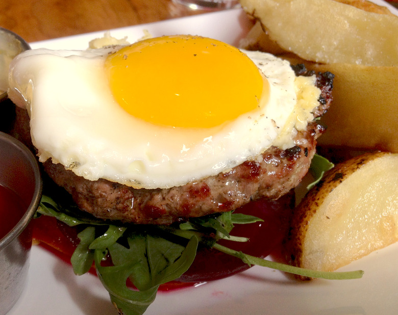 To clarify, it's not a beet burger. That sounds like a terrible burger, and I really like beets. Young children of the culinarily inclined learn at an early age which food materials are best for "fingerpainting." Beets are very much on that list, as are things containing turmeric. The Kiwi burger is topped with thinly sliced beet ("beetroot" on that side of the world), very sharp white cheddar and a sunny side-up egg.