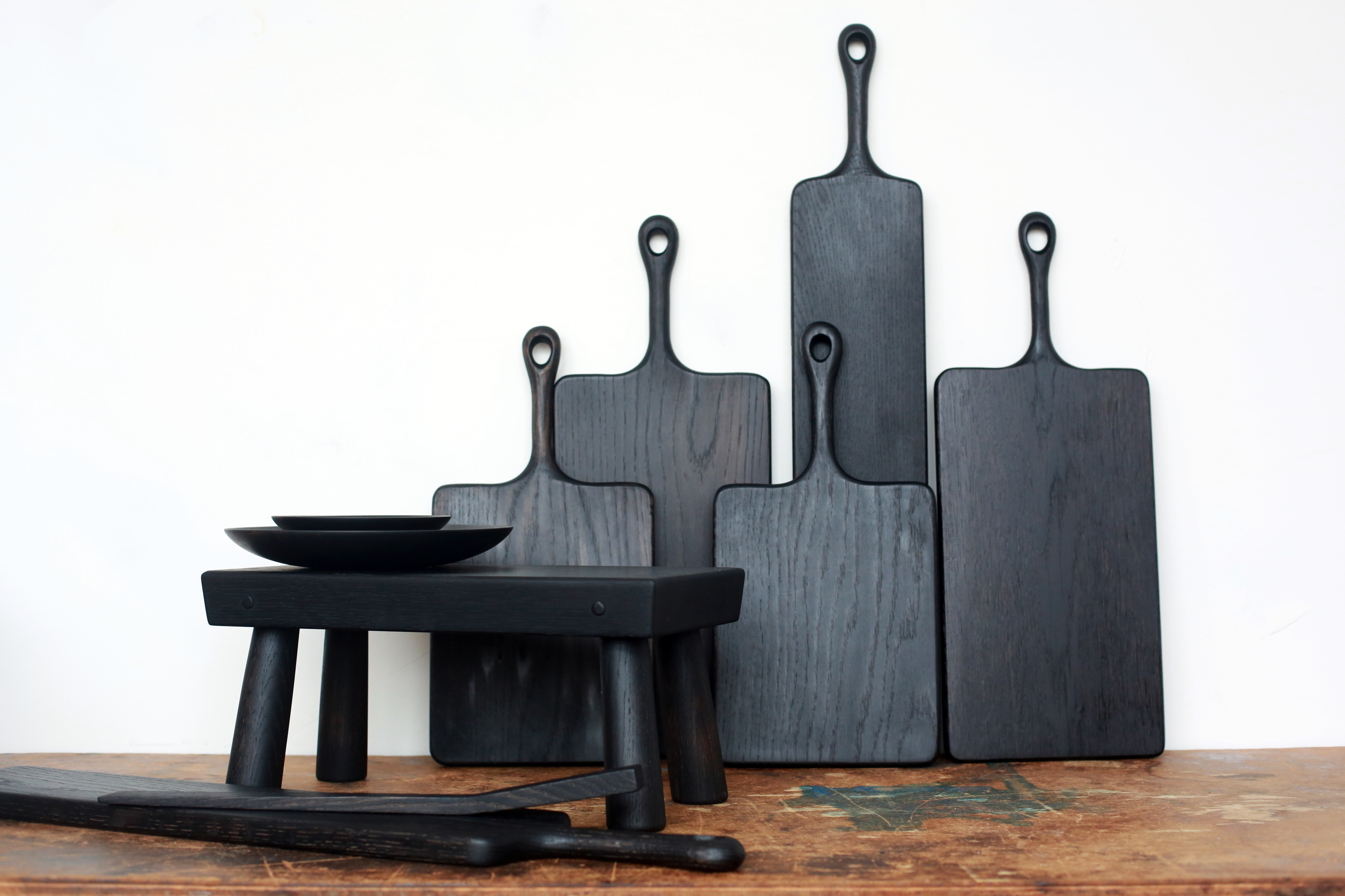 What's especially cool about these boards (made from white oak) is the all-natural process that transforms their shade to black from within — there's no dye or pigment applied. Instead, ferrous acetate is applied to the wood's surface and reacts with tannic acid, a natural component in white oak. The reaction causes the deep dark hue to appear from compounds inherent in the wood. Pretty awesome, not to mention environmentally safe. Currently the lineup features three types of boards, a butcher's block, a bent spatula and a step stool, with more items, like a mortar and pestle, on the way.