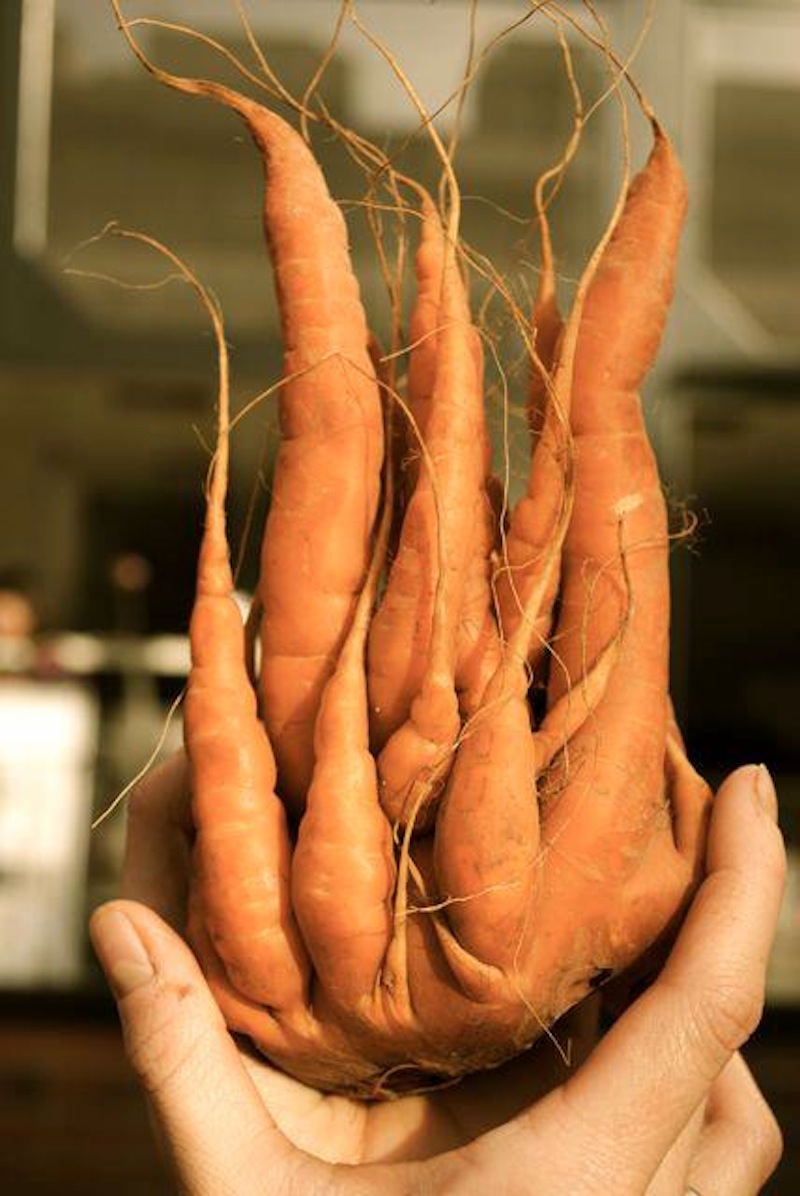 This is considered undesirable? We can think of a few chefs who would pay a premium and have a field day with these gnarly-looking carrots.[/caption]